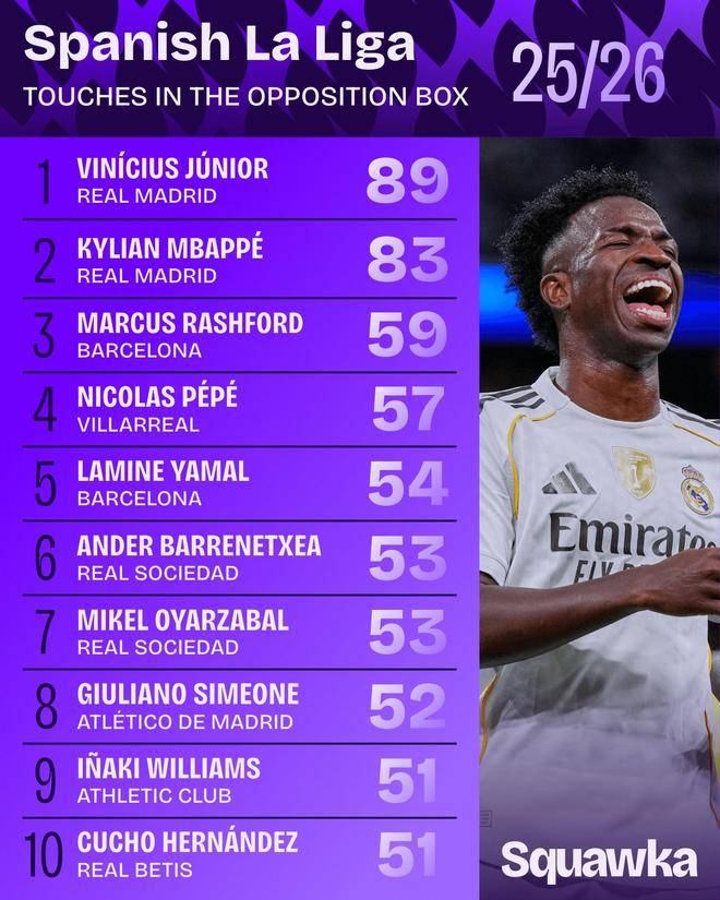 北京时间10月29日,知名数据平台Squawka列出了本赛季西甲联赛迄今为止,在对方禁区内触球次数最多的10位球员,皇马球星维尼修斯89次领跑榜单,姆巴佩83次位列第二。